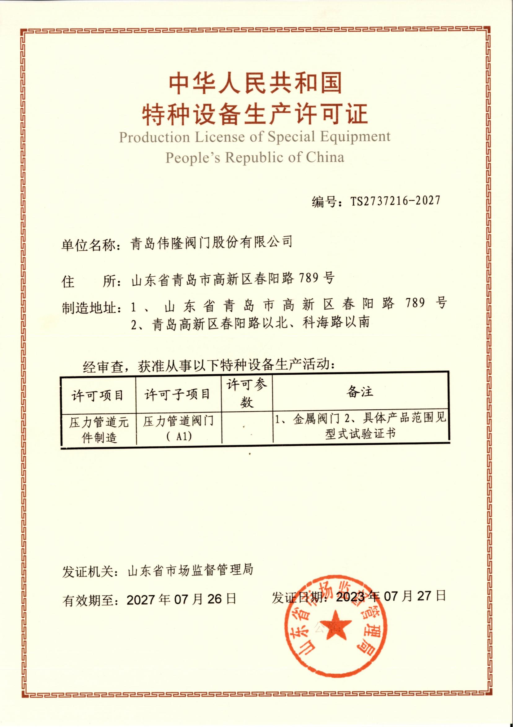 特种设备生产许可证