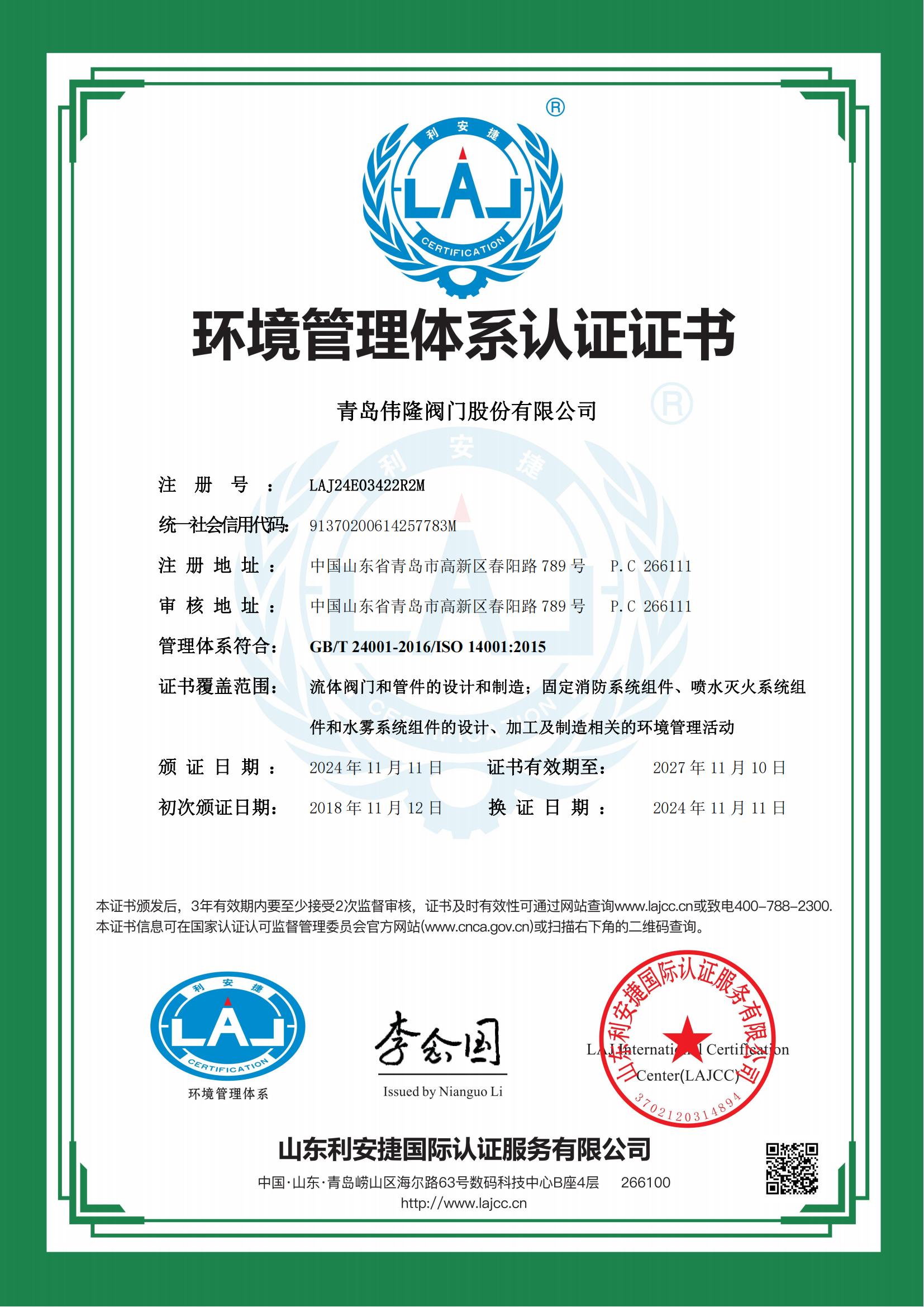 环境管理体系认证证书
